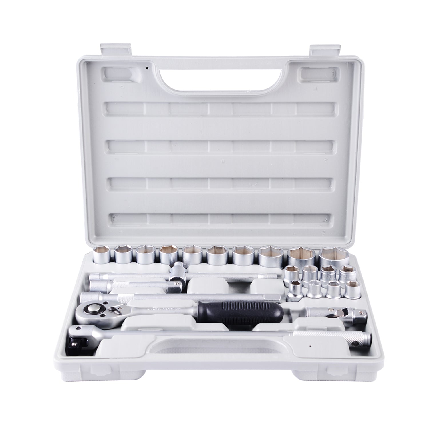 This 25-piece socket and ratchet spanner set is designed to cover the most essential tools for automotive, home, garage, and roadside repairs. Each tool is manufactured from premium chrome vanadium (CR-V) steel, providing superior strength, torque, and long-lasting durability.The set features a full-polish chrome finish for maximum corrosion resistance and a forged body to withstand tough applications. Whether you're a professional mechanic or a DIY enthusiast, this set is an excellent choice for efficient, reliable repairs. The included blow-molded storage case ensures secure organization and easy portability.