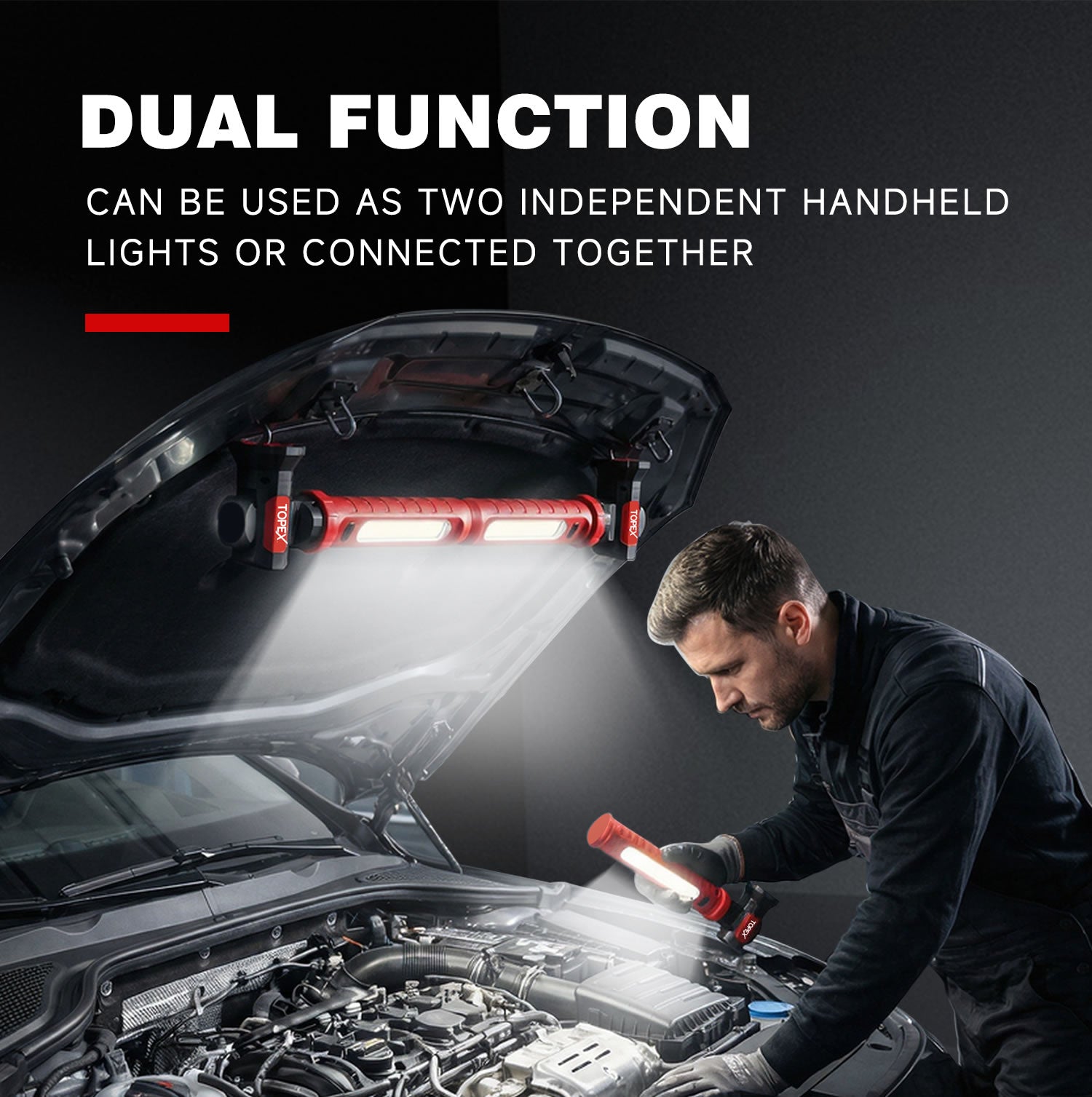 - Modular Dual-Light System: Rechargeable led work light features a split-body design. It can be used as two separate handheld lights or seamlessly combined via the top magnetic buckle into a powerful lighting unit emitting 2000 lumens.