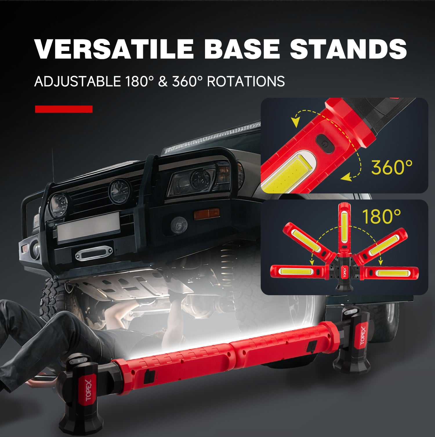 - Strong Magnetic Base & Hidden Hook: Both ends of the work light are equipped with dual powerful magnets for secure attachment to metal surfaces like under hoods. A hidden hook allows for hanging in non-metal areas. The 360° rotatable body offers flexible positioning to accurately direct light where needed.